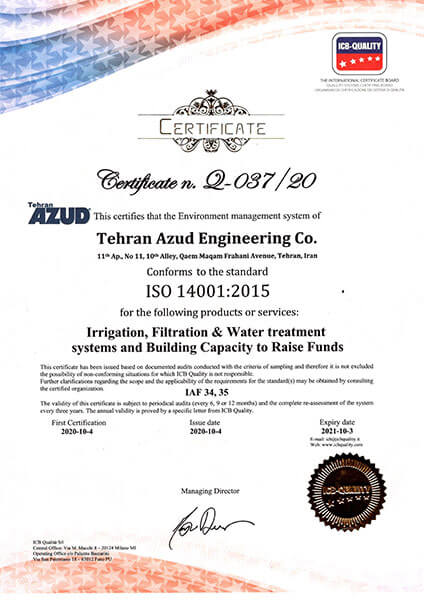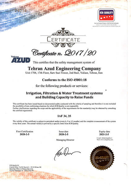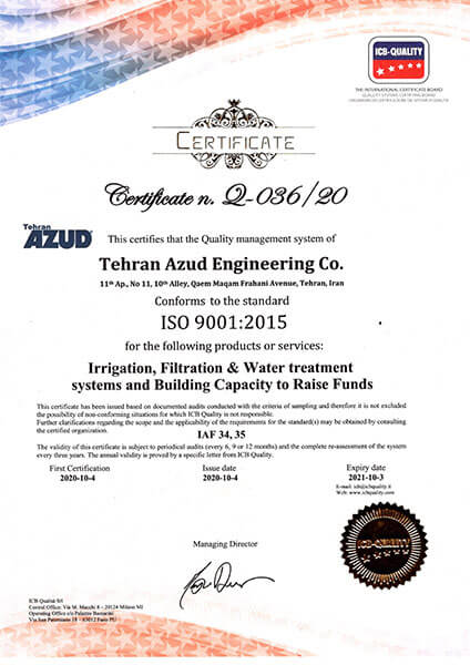 Tehran AZUD Engineering Company has started its activity since 2001. Initially, the company, as a representative of AZUD company of Spain, imports and distributes pressurized irrigation equipment such as disc filters with the possibility of manual or self-cleaning washing, drip irrigation tapes, various types of driplines with Compact and PC (pressure compensating) dripper.